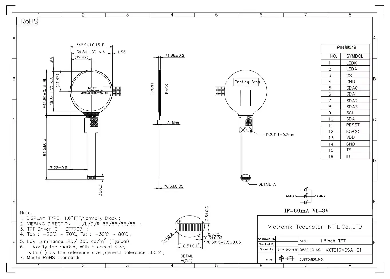 VXT016VCSA-01 é um módulo TFT-LCD. É composto por um painel TFT-LCD, IC do driver, FPC, uma unidade de luz traseira. A área de exibição de 1,6 ¢ contém 400x400 pixels e pode exibir até 16,7 milhões de cores. Este produto está de acordo com o critério ambiental do ROHS.